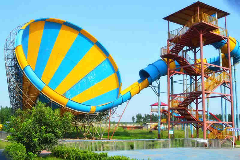 大喇叭滑梯:大喇叭滑梯是根據(jù)動能原理,游玩者在鋼平臺上乘坐皮筏從入口件經(jīng)過水的浮力、沖力以及潤滑作1用下,以較高的勢能獲得速度,冉冉進(jìn)入黑洞滑道區(qū)域,旋即急速下墜,獲得高速,分開黑洞滑道進(jìn)入大喇叭筒體內(nèi),在慣性與重力的作用下,人隨皮筏在大喇叭筒內(nèi)左右搖擺、跌蕩起伏,最后慢慢滑向出口,進(jìn)入落水池。游客在滑行過程中,可體驗到高速離心及騰空飄拂之刺激與樂趣。
